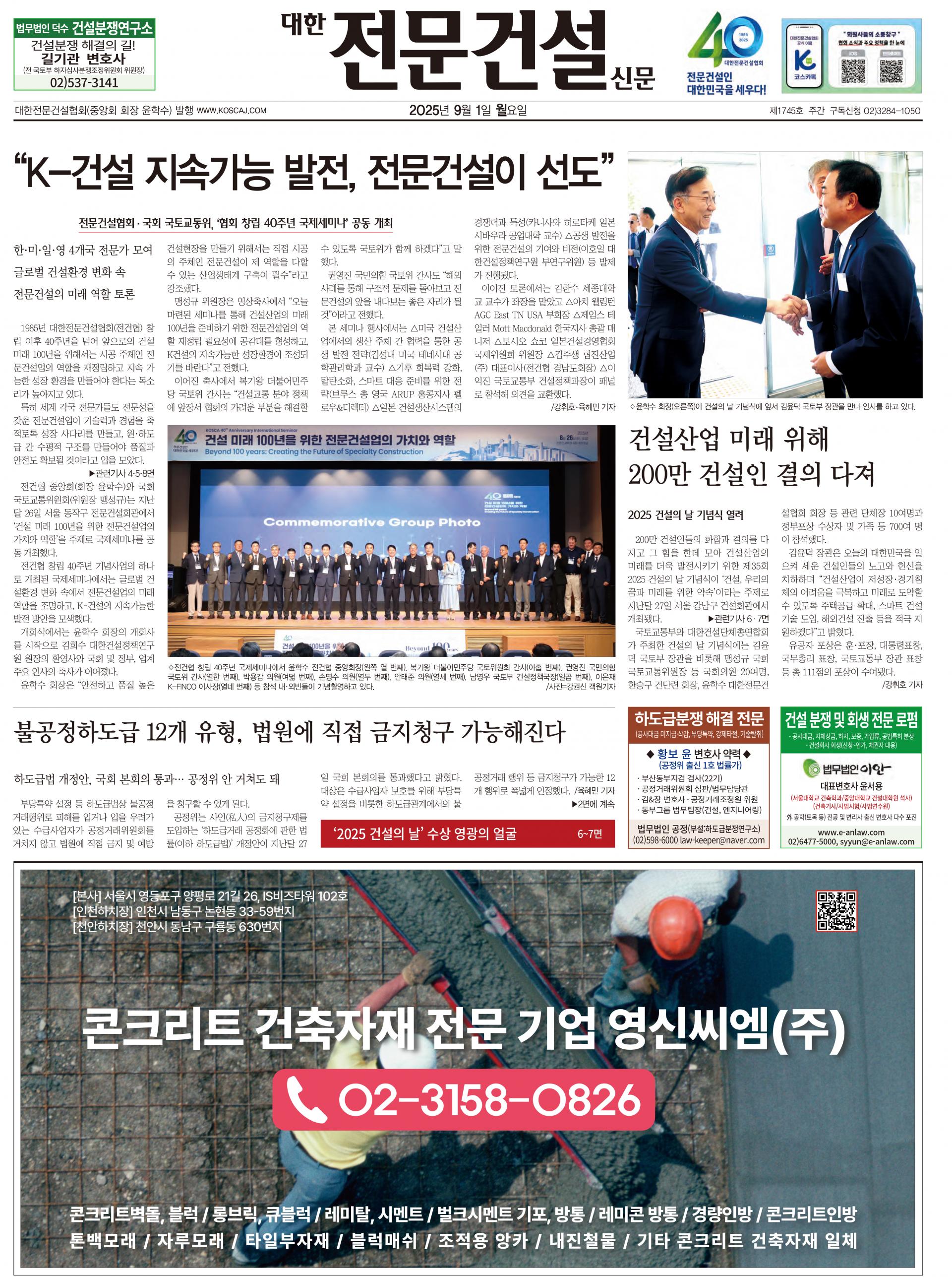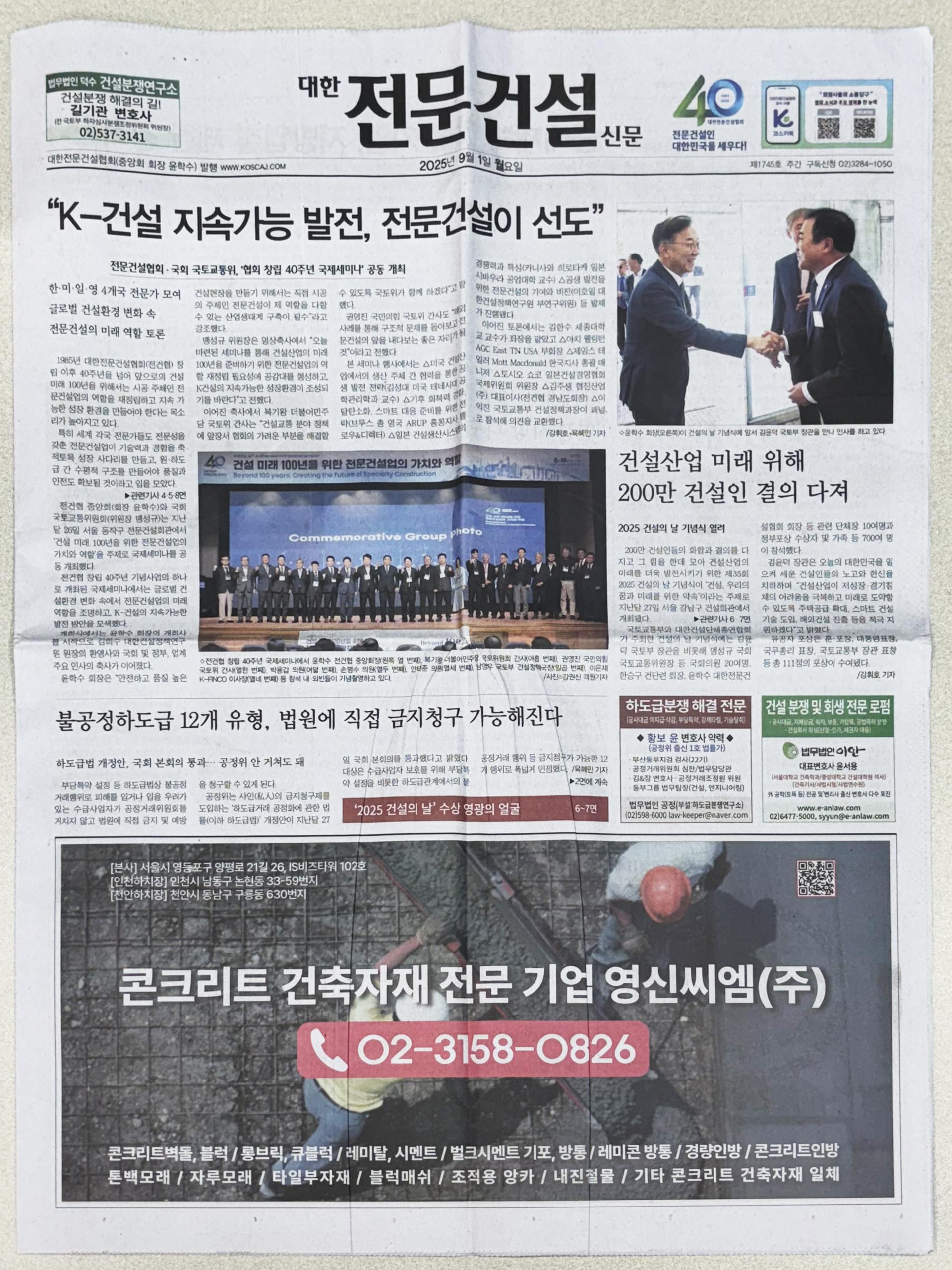 2025.09.01 대한전문건설신문에 게재된 영신씨엠 지면 광고입니다.